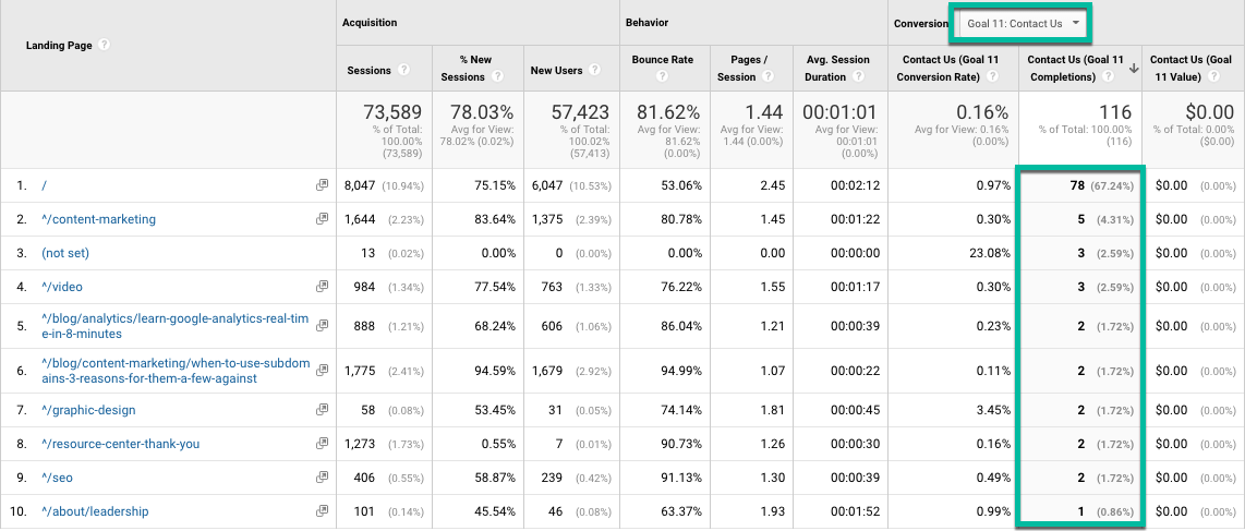 Navigate to Behavior → Site Content → Landing Pages. Then go to the right-hand drop-down and select your macro goal. In this case, we are going to select the goal “Contact Us.”