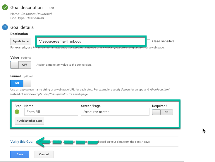 Create a new destination URL goal. Make sure the “thank you” page URL is unique from all other URLs on your site. Ensure the only way a visitor could reach this page is through the gated form fill. This page needs to be un-indexed so visitors cannot reach the page from Google. This requires everyone who reaches this page to submit contact information first.