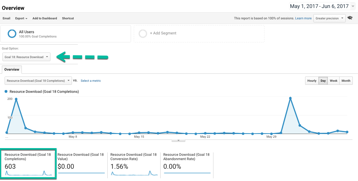1. Take a look at how many downloads you have had since launch. Go to Conversions → Goals → Overview. Hit the drop-down to select the eBook download goal you have set up.