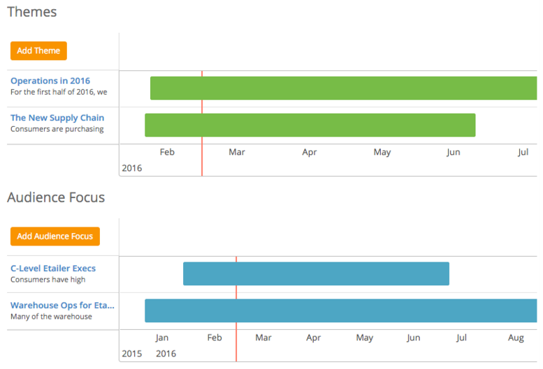 Create themes, or focus areas, for your content production calendar. You can use what you learned from your buyers to guide these themes, along with your company’s top-level marketing and sales initiatives. Look for the following when you plan your content themes: