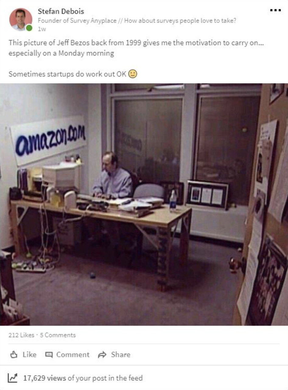 I’ve done it myself. I found this great picture of a young Jeff Bezos on Twitter, which received a lot of engagement. I just took the picture, made it my own and shared it on my LinkedIn where it received great results.