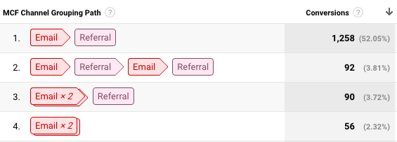 Viewing the Top Conversion Paths report will highlight common paths users are taking before conversion. If 90% of converters are originally discovering the site via organic search but don’t convert until being served a remarketing ad on social, you can get an idea of what’s working.