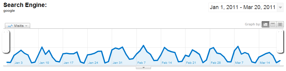 Here’s an example of a business in the B2B cloud computing sector with steady organic traffic levels through the first killer Panda update – in fact, it claimed some non-paid search traffic gains toward the end of February after Panda rolled out. The site publishes multiple, search-friendly industry news articles each day. Its SEO viability is clear as it gained keyword search referrals throughout the launch of Panda. The number of organic referring keywords to the site in February represented a 14 percent increase over the number of referring keywords it had in January.