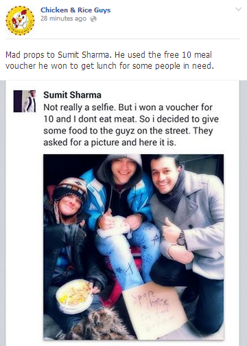 Chicken and Rice Guys’ owners were so impressed with his selflessness that they declared Sumit the first-ever “Chicken and Rice Guys Give-Awayer.” This means he can go to the food truck any time for free food (to eat or share). His act of kindness was highlighted on the food truck’s social platforms, and Sumit’s growing fan base has posted notes of praise across the web.