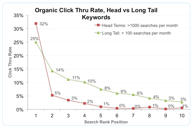 The value of good rankings beyond the first position increases when businesses use long tail keywords. As Brafton has reported, long tail keywords are sometimes proven to bring in more relevant traffic than highly competitive “head” terms. Indeed, Optify found that ranking No. 1 was very important when using head terms, but companies going for long tail SEO see good clicks from results positioned throughout the first page.