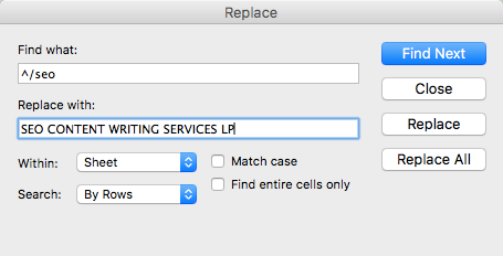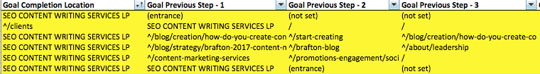 It’s not pretty, but this chart shows you the previous three pages visited for every conversion. If I wanted to see how a particular page or section of a website is performing on a last interaction basis, I would export this sheet into an XLS file, then use the find/replace functionality to identify my target page(s). For example, to know how my SEO Content Writing Services page is performing, I would do a find and replacefind/replace for the URL “^/SEO”.