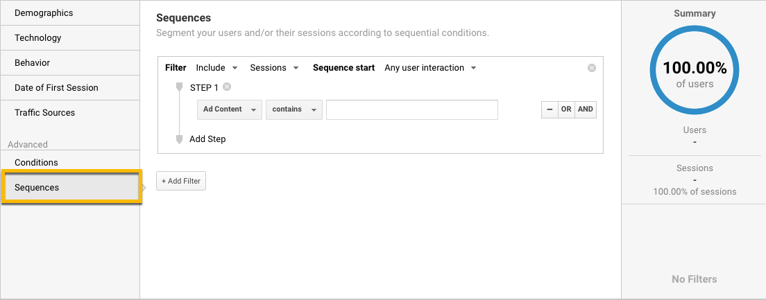 Create a new advanced segment and select “Sequences.”