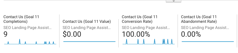 This page was involved in nine conversions. In layman’s, nine times a visitor viewed this page at some point during their session, then contacted us.
