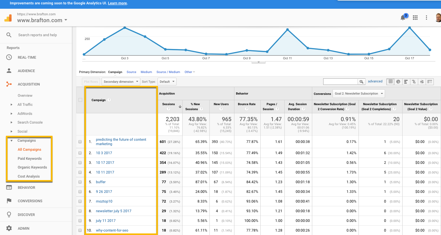 Note that the Medium and Source are properly labeled as “email” and “newsletter,” respectively. We are in good shape so far. Now we need to ensure that our activity is being tracked in a Campaigns folder. Go to Acquisition → Campaigns → All Campaigns.