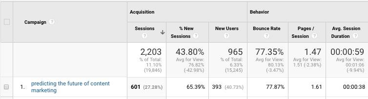 We named this campaign “Predicting the future of content marketing” – it was an eBook we recently sent out in an email campaign. This report is awesome because we now know exactly how many people clicked on the email link, and what they did on the site after they arrived. We can analyze these visitors six ways to Sunday; how many goals they completed, the pages they visited, their bounce rate, etc.
