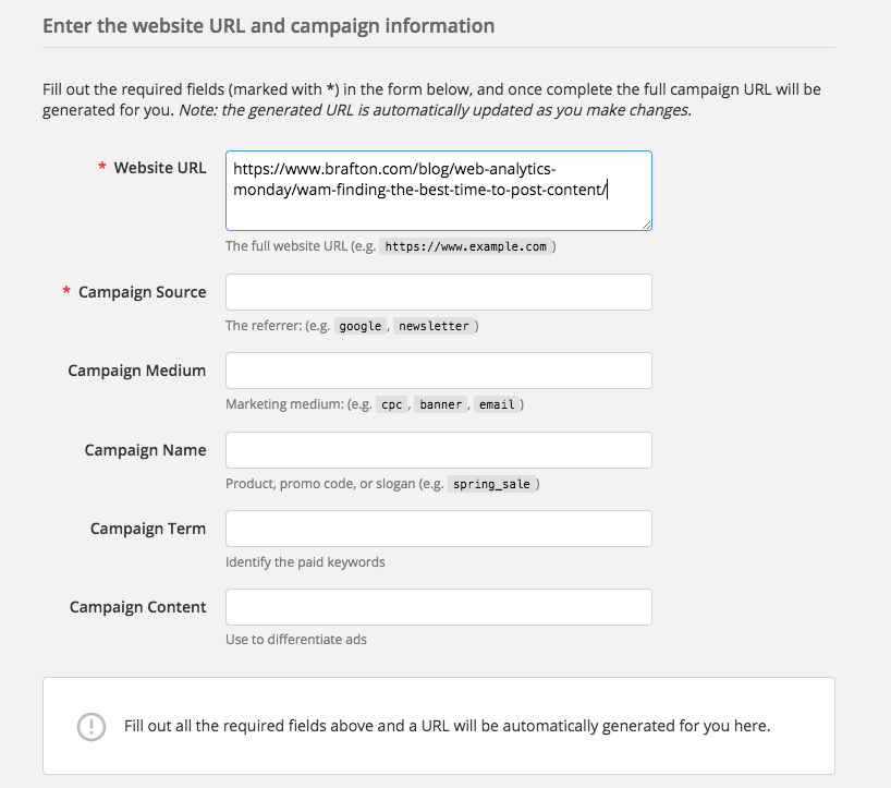 We will use this article as an example. Let’s pretend we are going to send it out in an email campaign next week. Go to the Campaign URL Builder and enter the URL in the top field.