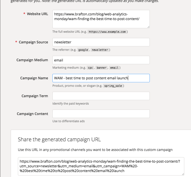 Since we are sending this article out to our newsletter via email, we will name the source “newsletter” and the medium “email.” I’m also going to give this a unique folder name: “WAM – best time to post content email launch.”