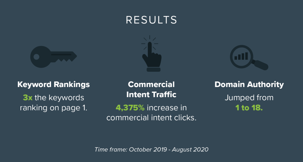 The result of this exercise was an increase of over 100% in total search potential for our commercial-intent keywords. The intent of the queries was exactly the same, the language they used to search for those services was very different.