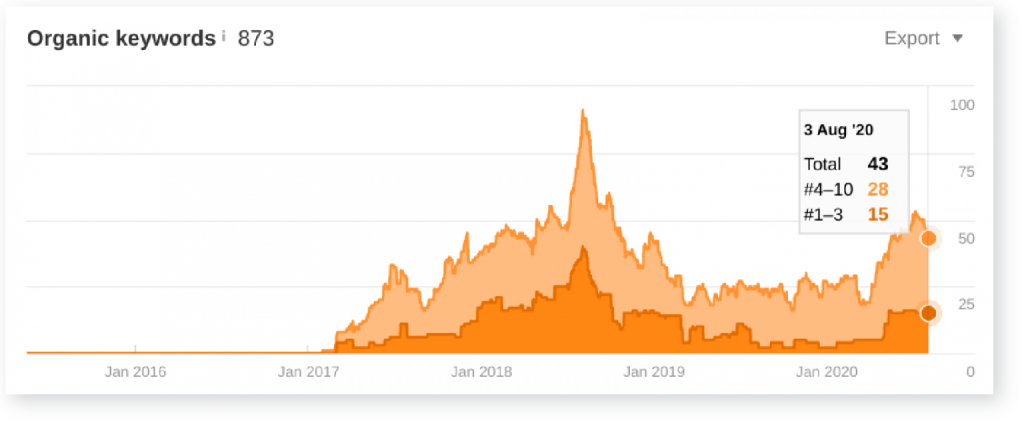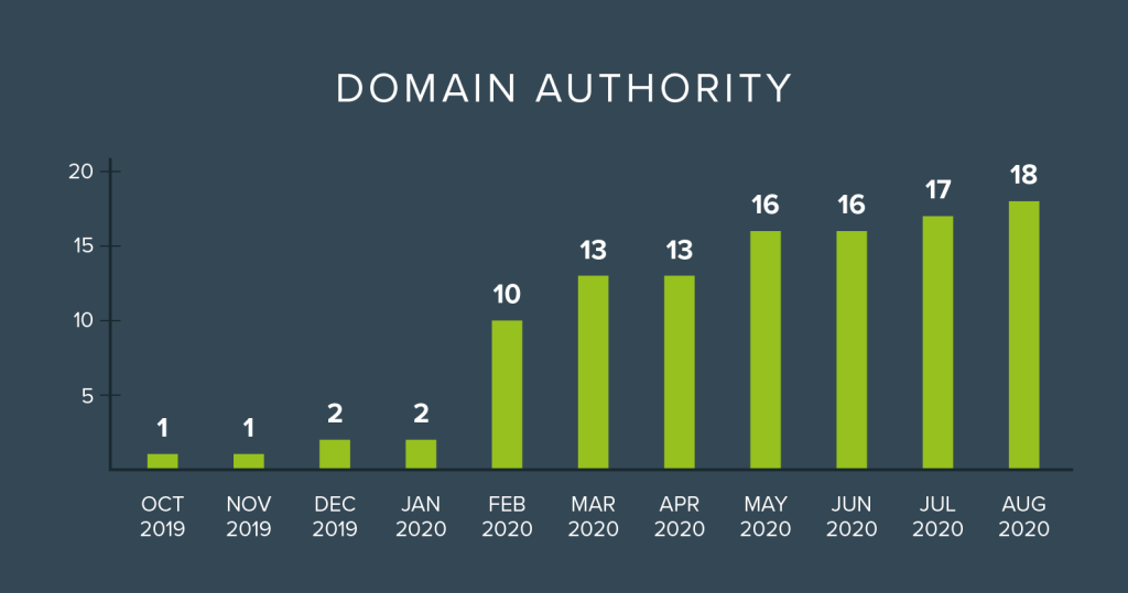In January our Domain Authority was 2, very normal for a brand new website. By August our Domain Authority was 18. We are at roughly half of our top competitors’ Domain Authorities in less than a year.