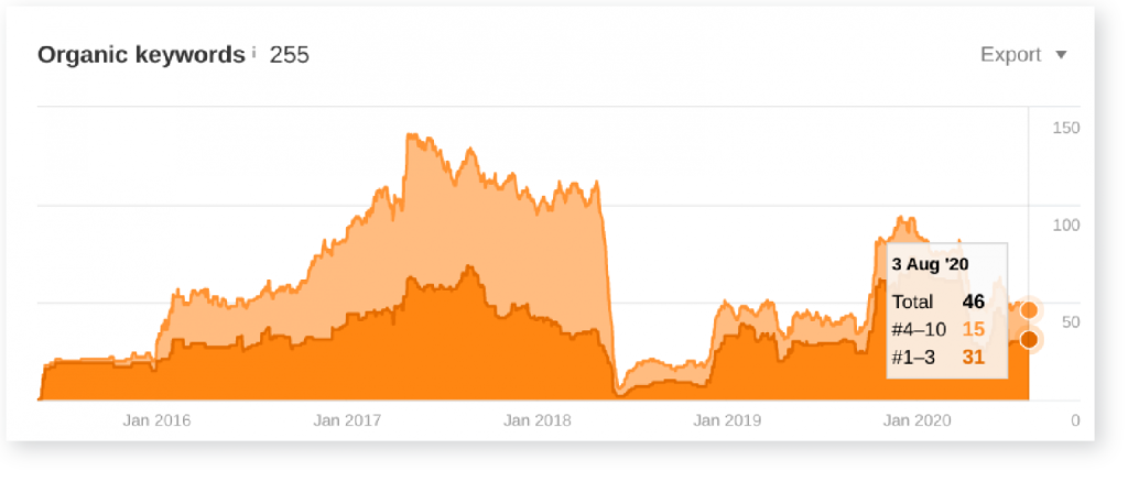 But by August, we had tripled both numbers, raising our total page 1 keywords to 381, and position 1-3 keywords to 93.